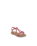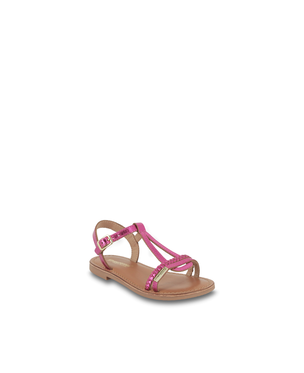 Learn more +The Badou children's flat sandal features textured leather straps in metallic, interwoven colors that form a teardrop shape on the top of the foot.