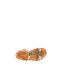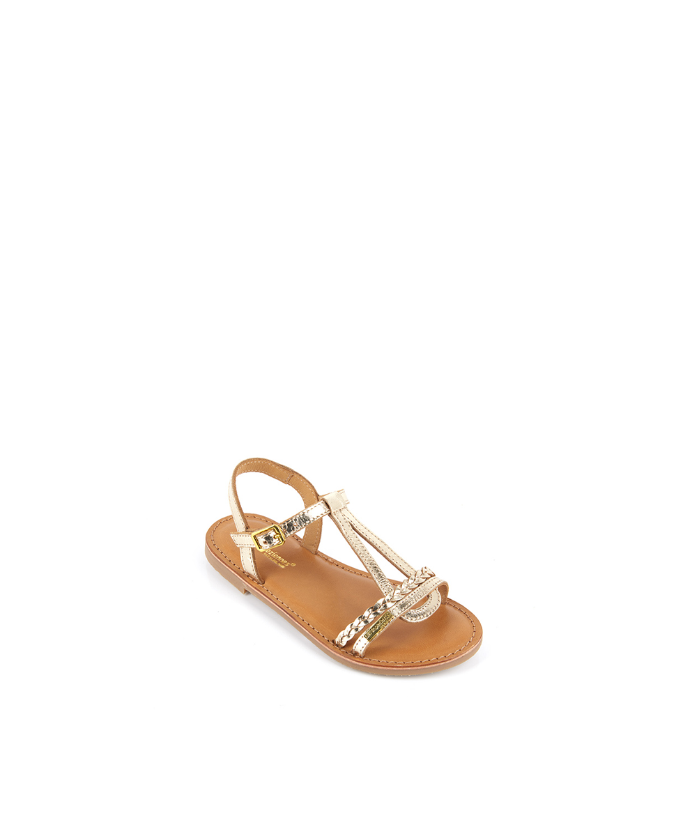 Learn more +The Badou children's flat sandal features textured leather straps in metallic, interwoven colors that form a teardrop shape on the top of the foot.