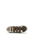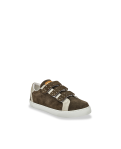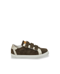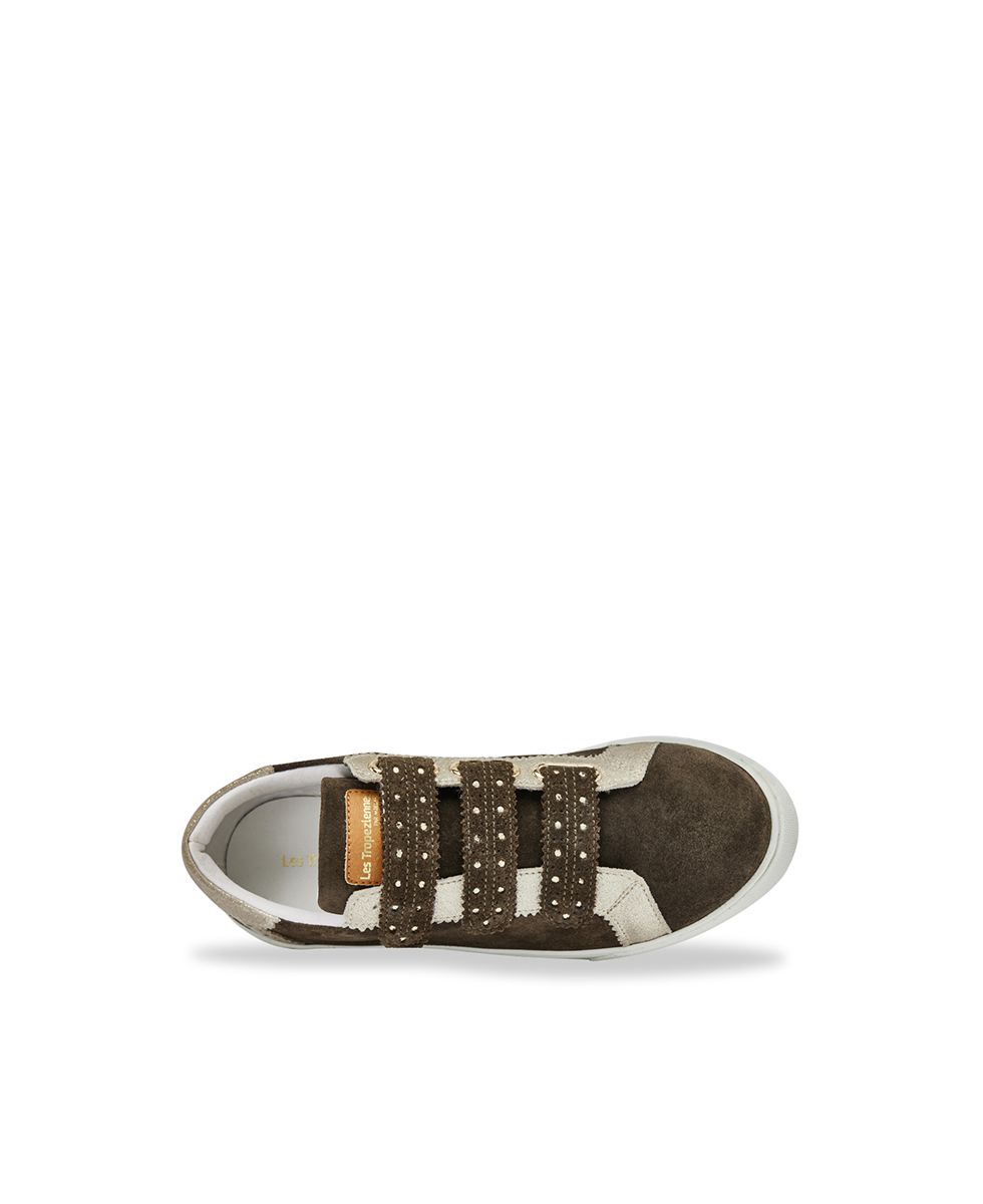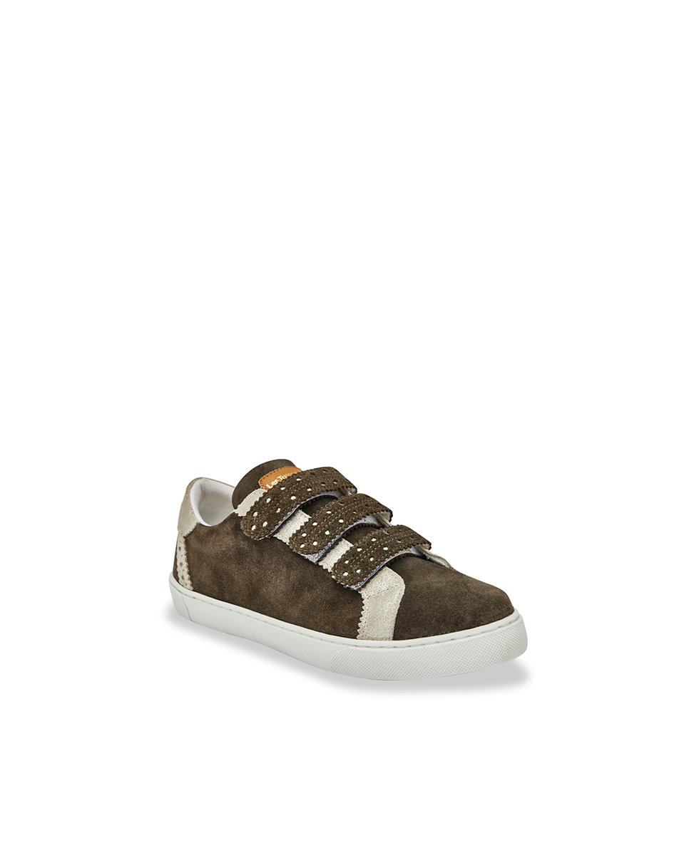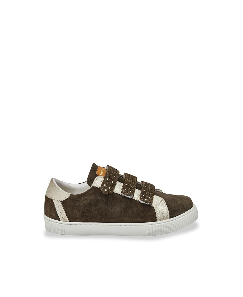These suede leather sneakers are embellished with leather velcro fastenings and glitter stripes. They'll add a cool touch to your dressy looks or originality to your casual outfits.