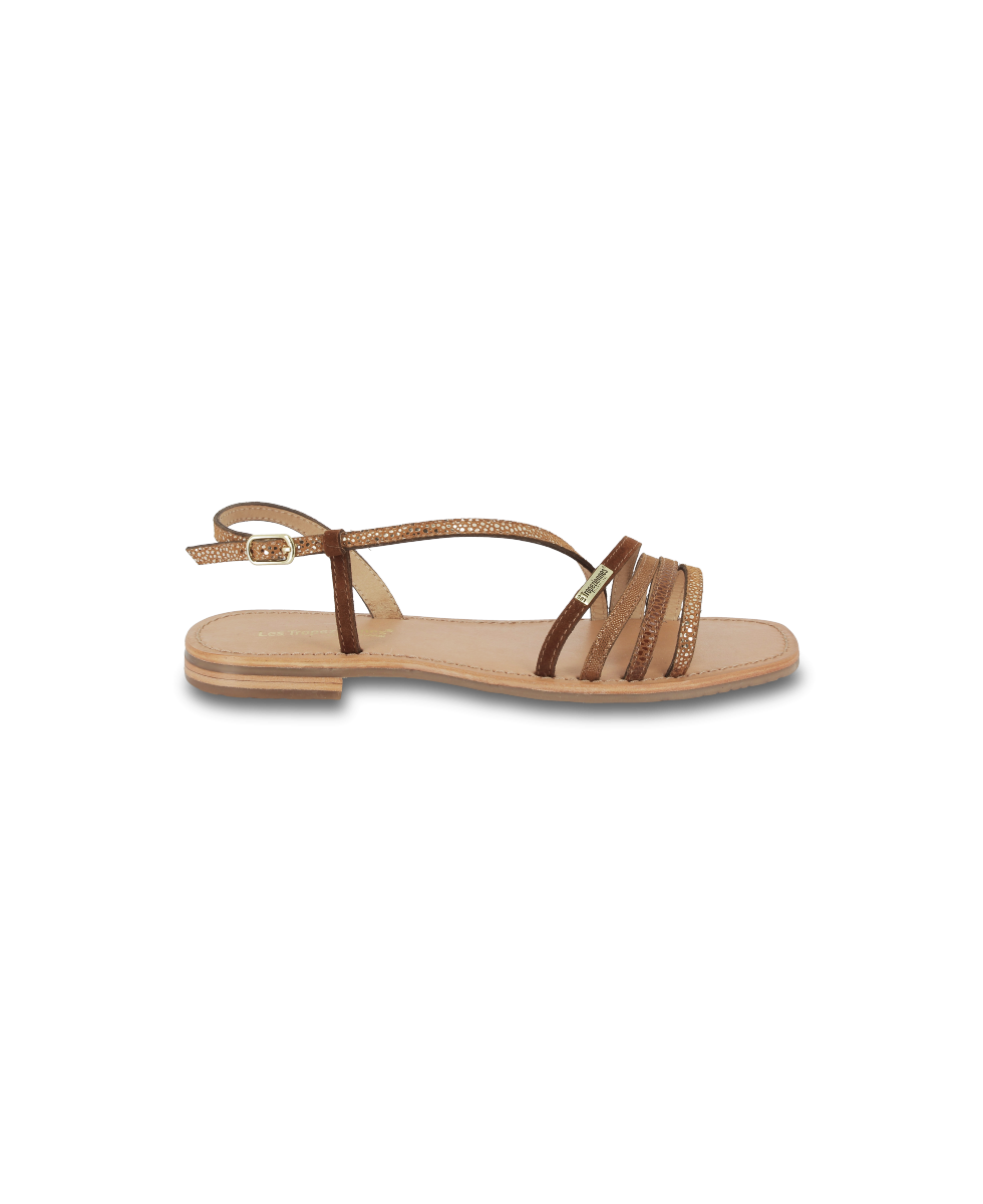 Hudel is a pretty flat sandal for women. We love its modern look, with slender leather straps in metallic colors on the front of the foot.