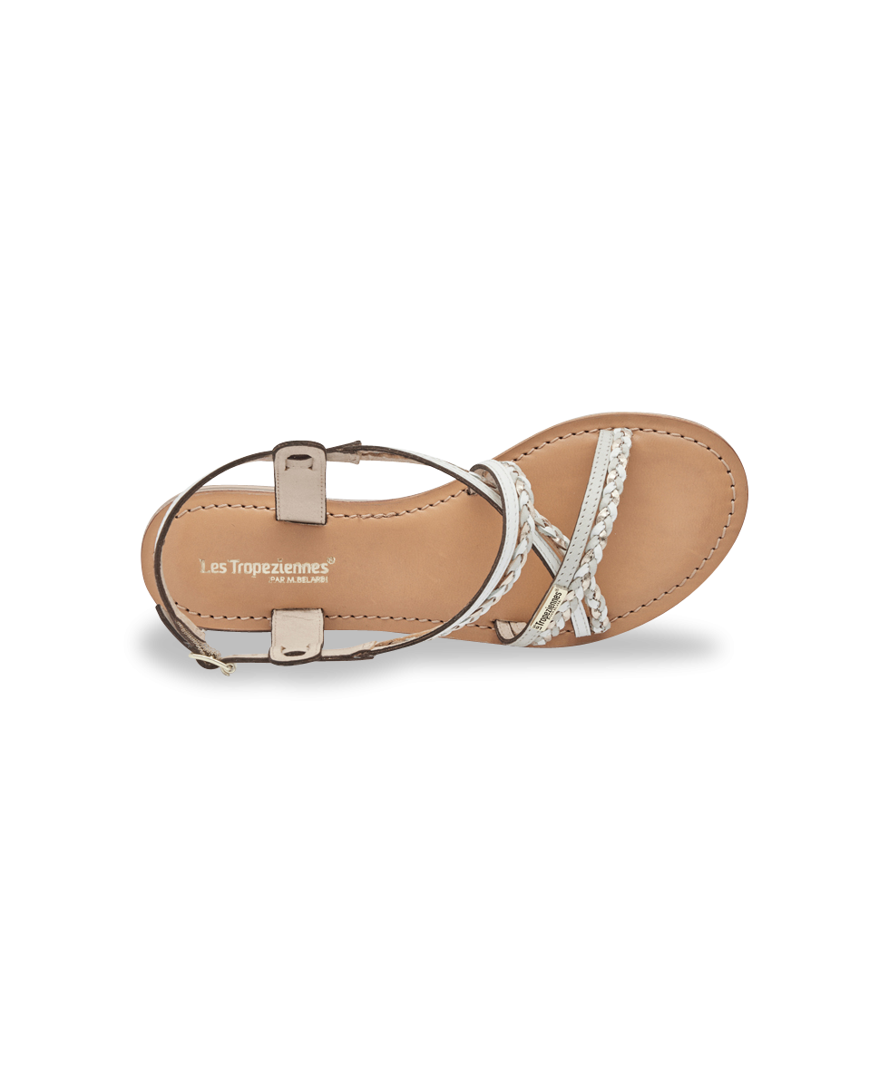Learn more +Fall for the Homongo flat sandal for women. A summer staple with two-tone braided leather straps that cross over each other at the top of the foot.