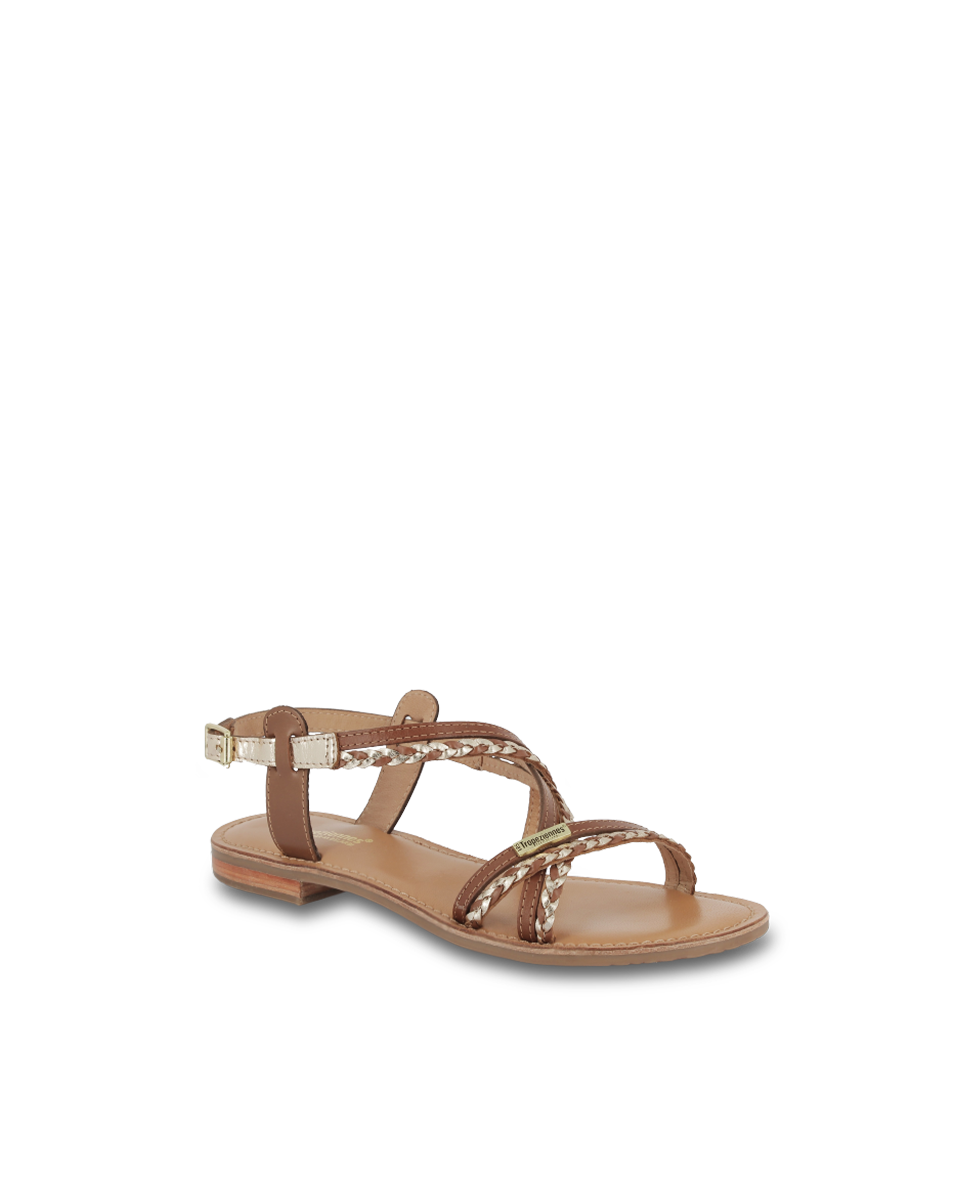 Learn more +Fall for the Homongo flat sandal for women. A summer staple with two-tone braided leather straps that cross over each other at the top of the foot.