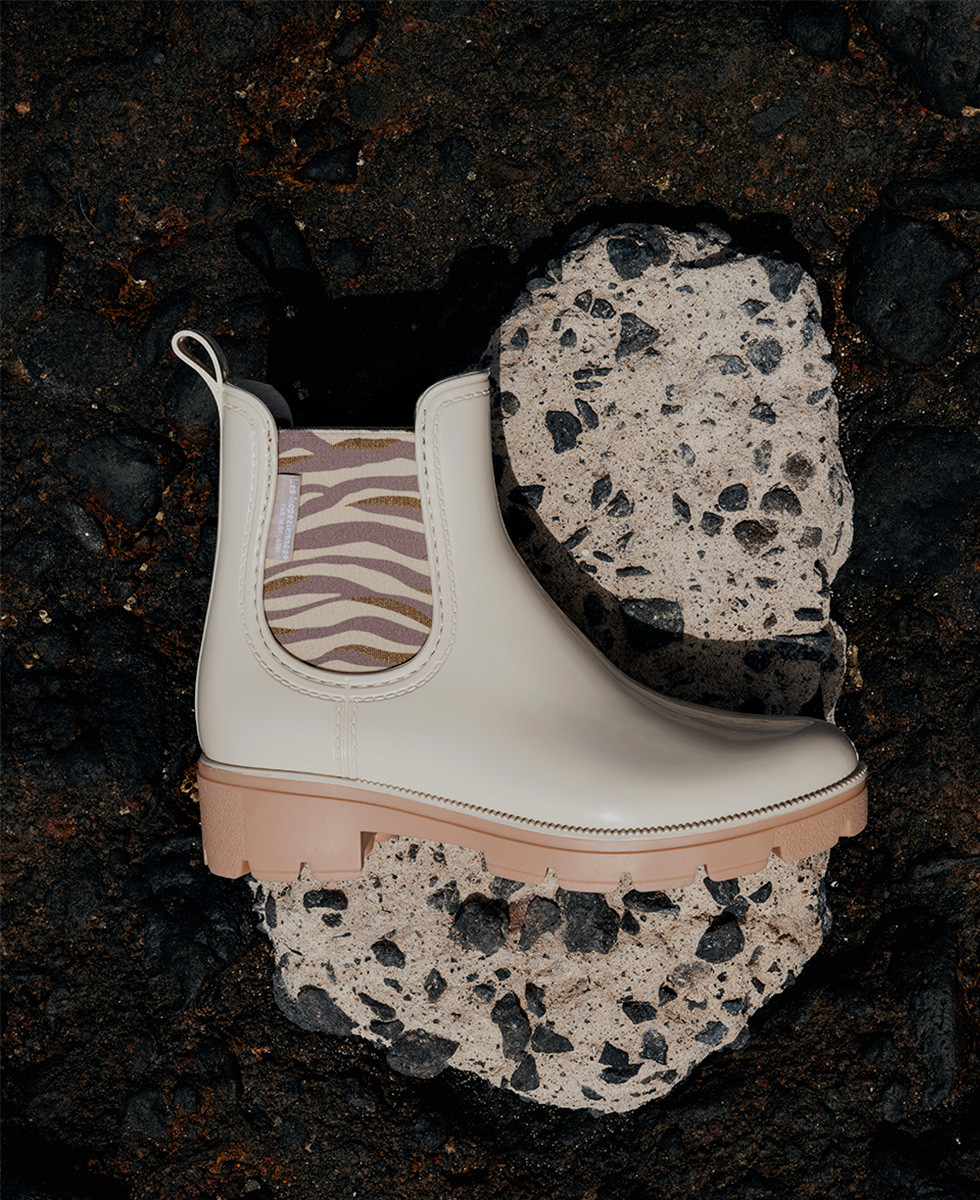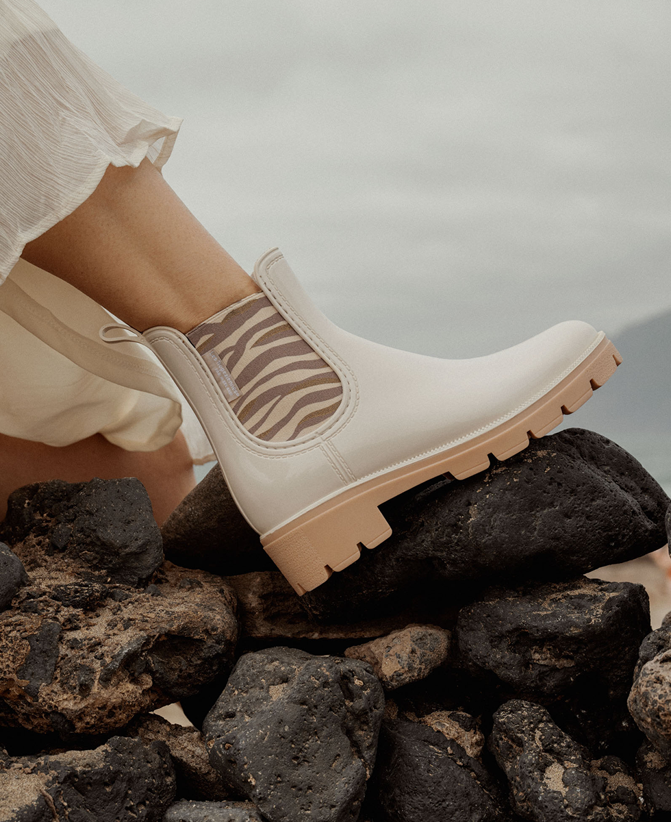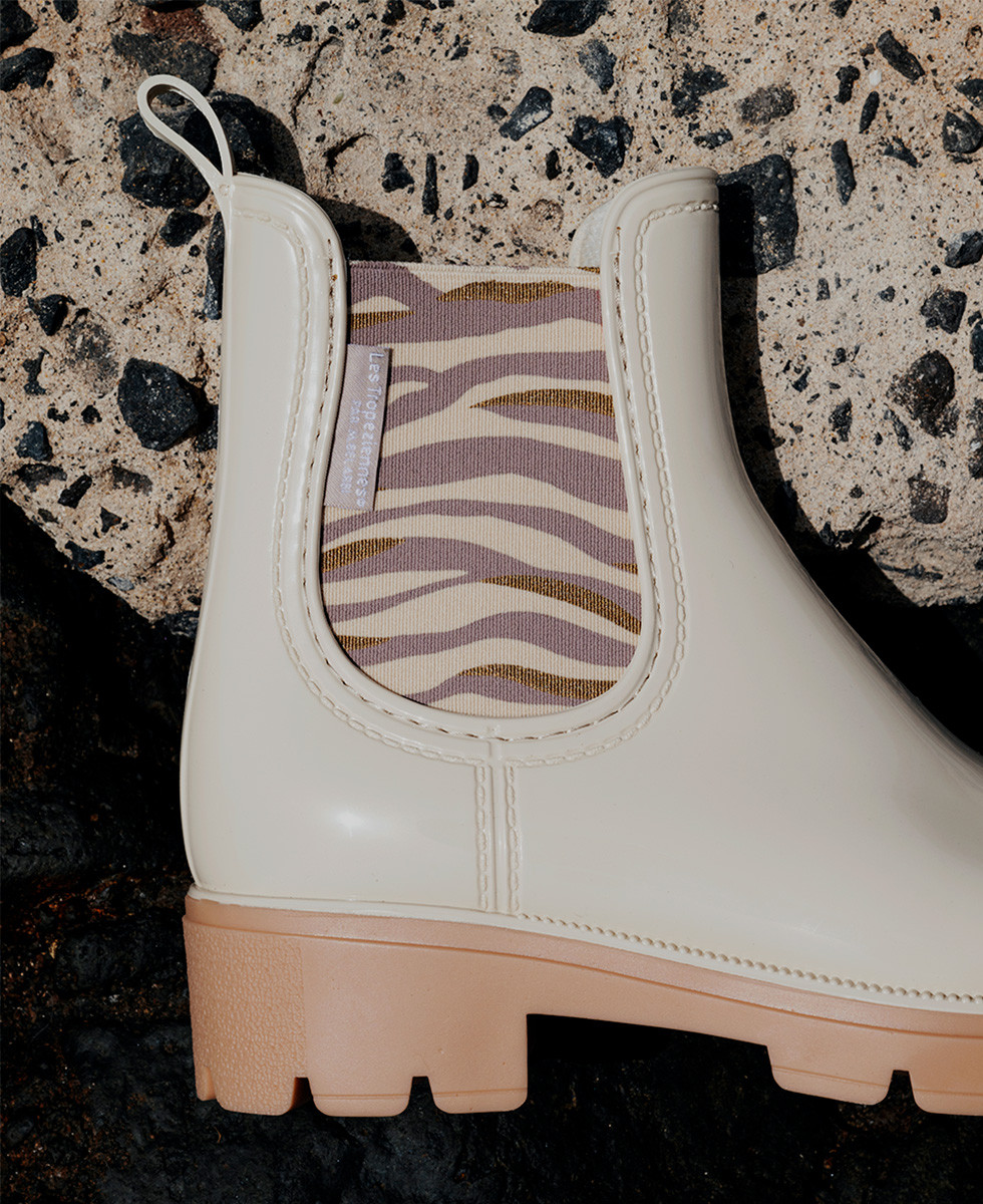 Learn more +Make a statement with these women's rain boots featuring a bold, modern design. Available in cream, khaki-leopard, navy and black-zebra, they offer a variety of finishes to suit all personalities and fashion tastes.