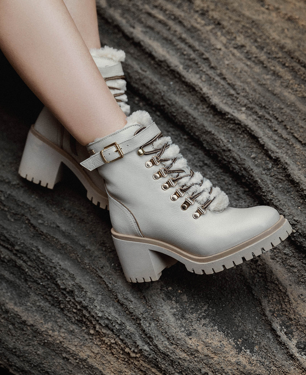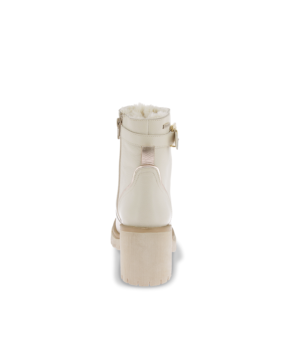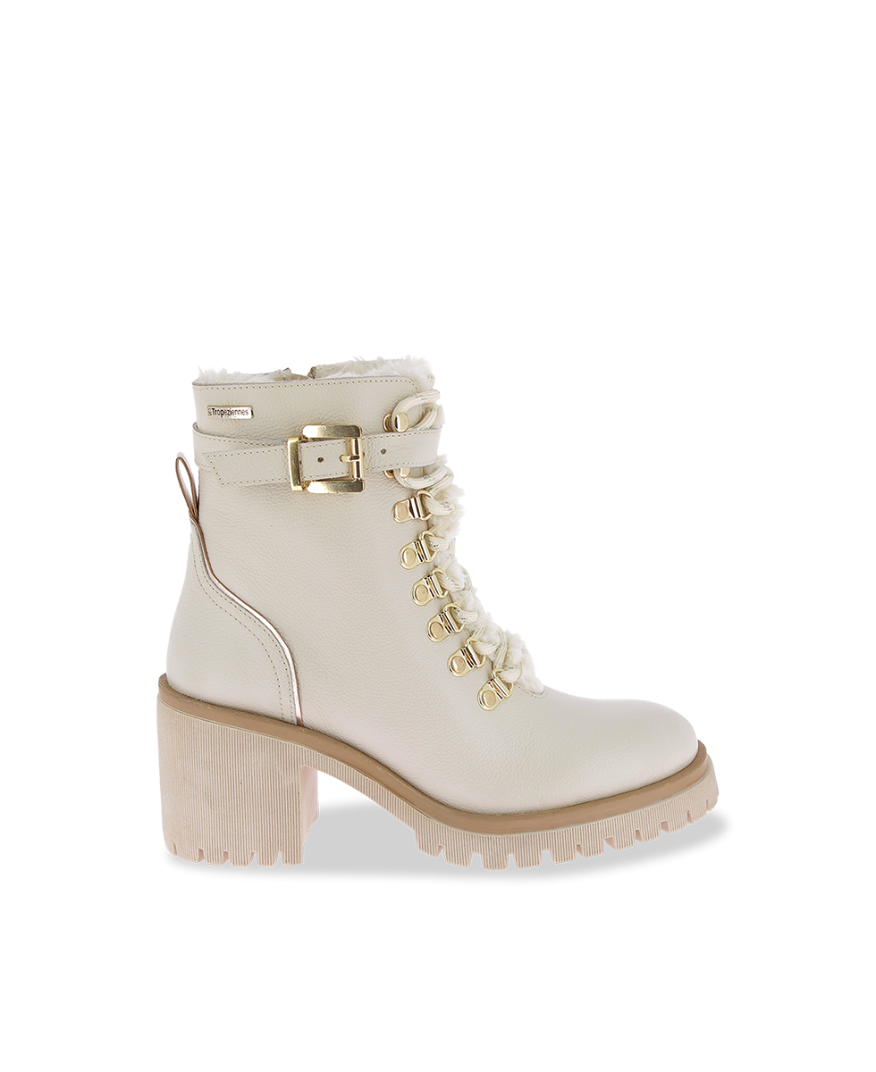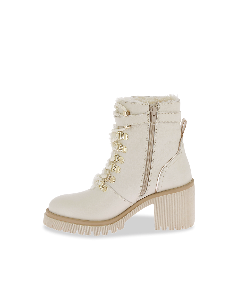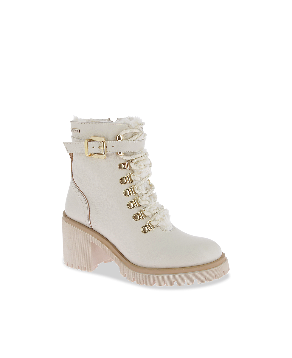 Learn more +These women's heeled boots combine bold style with winter comfort. Available in white, black and tan, they suit all fashion tastes. Their leather upper is enhanced with refined gold details, such as a buckle and lace hooks, for a chic and modern look.