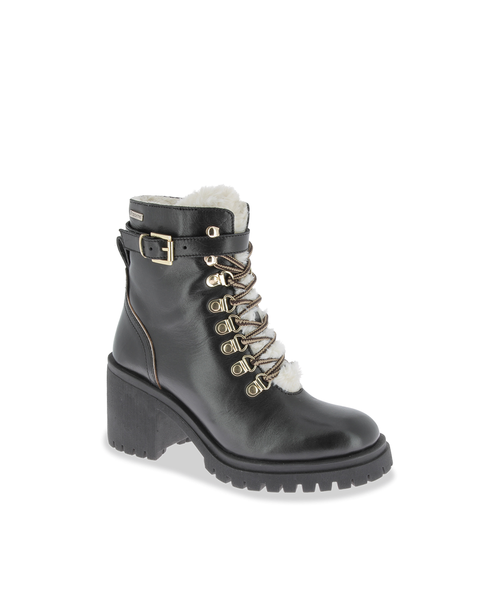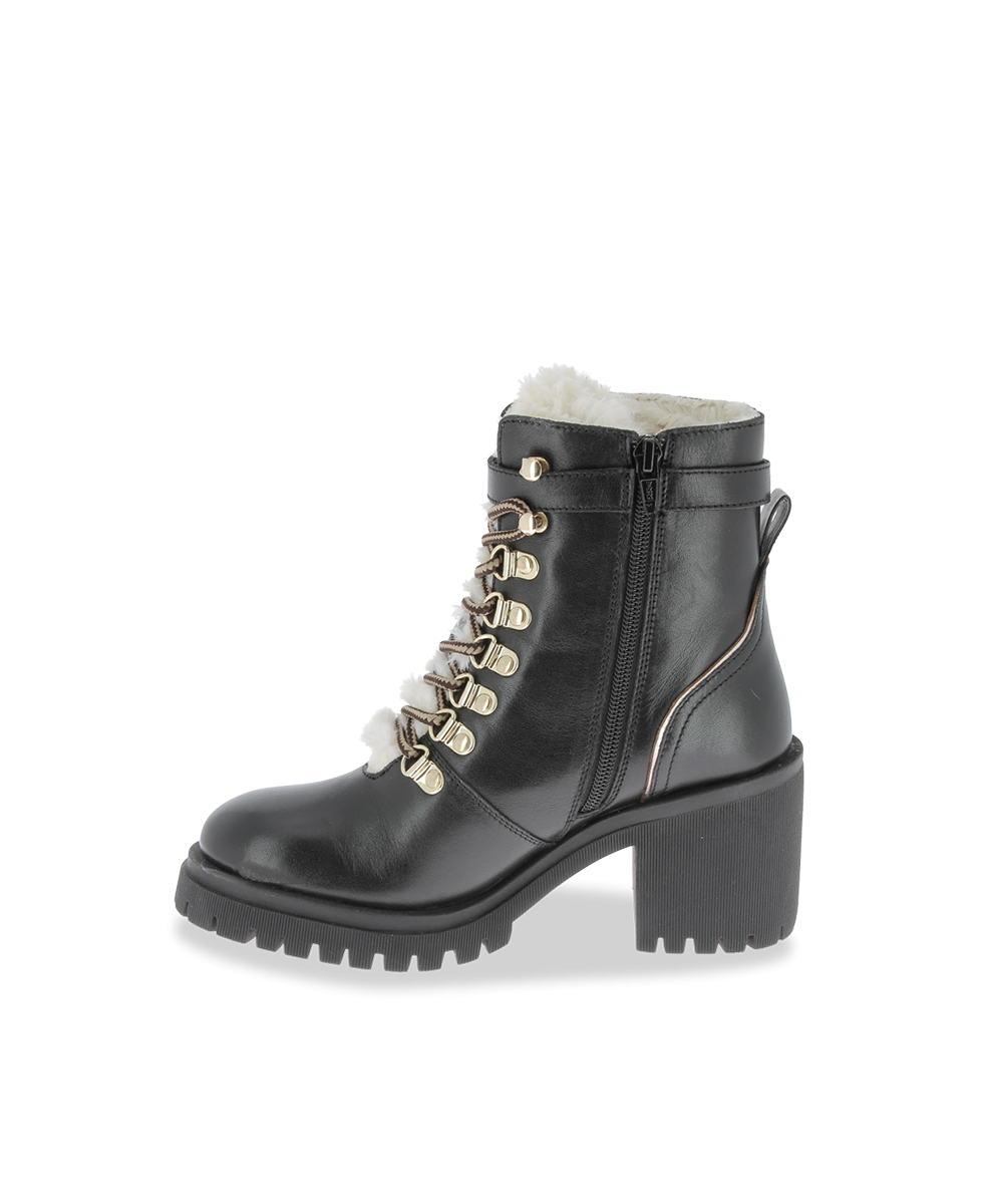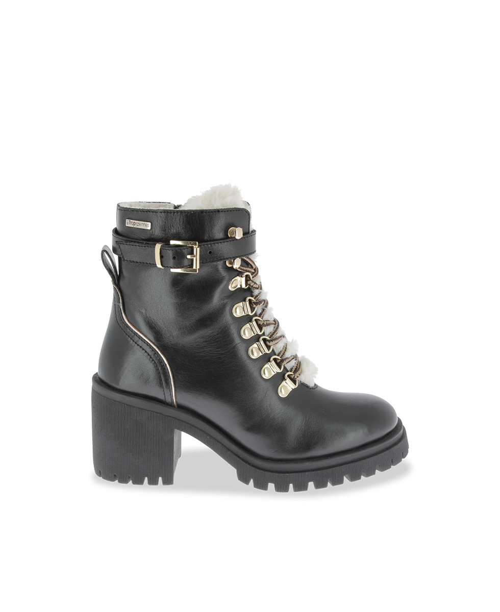 These women's heeled boots combine bold style with winter comfort. Available in white, black and tan, they suit all fashion tastes. Their leather upper is enhanced with refined gold details, such as a buckle and lace hooks, for a chic and modern look.