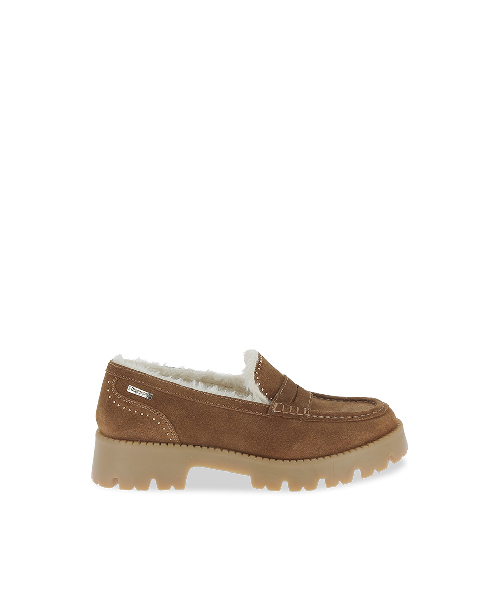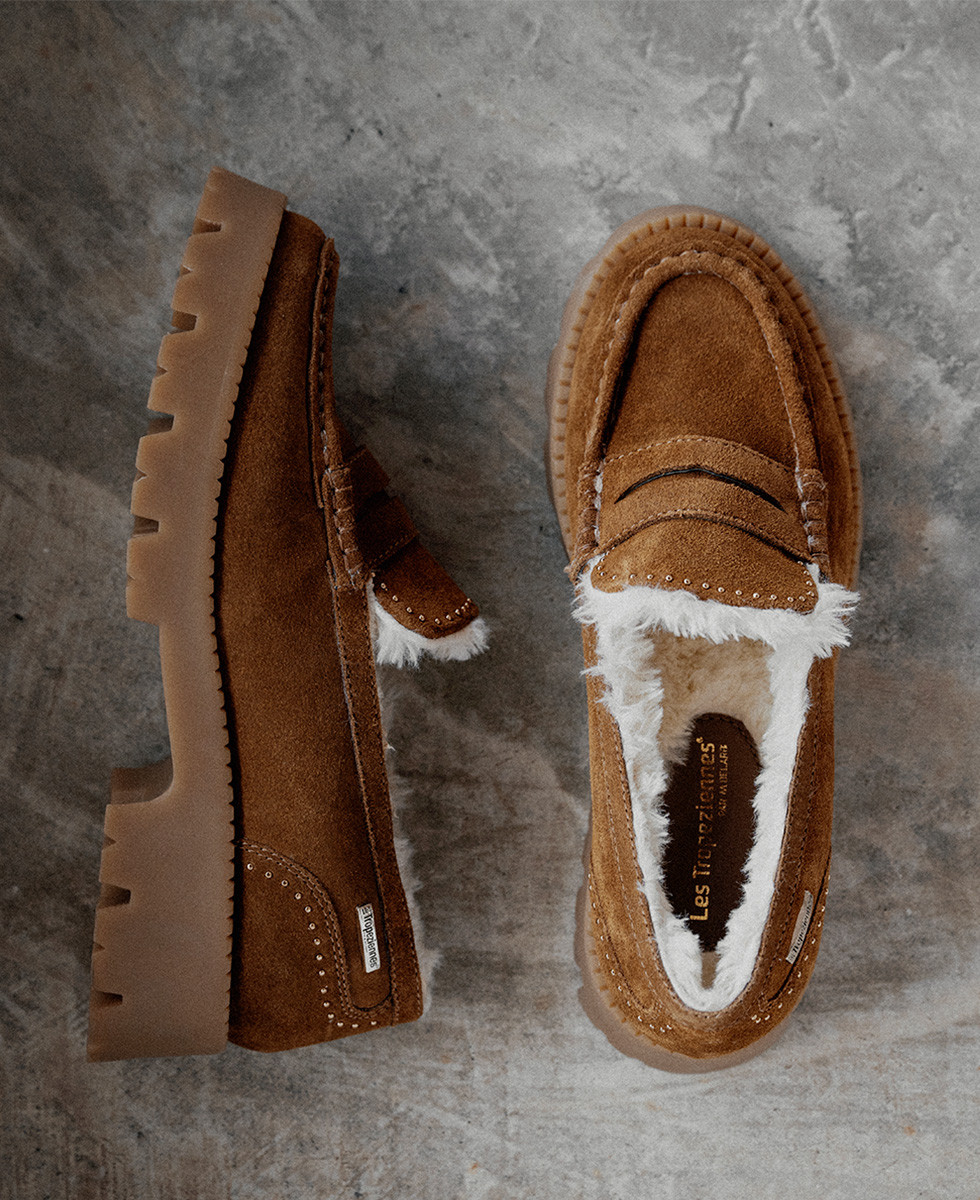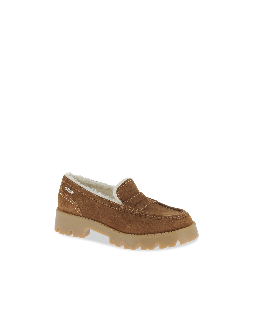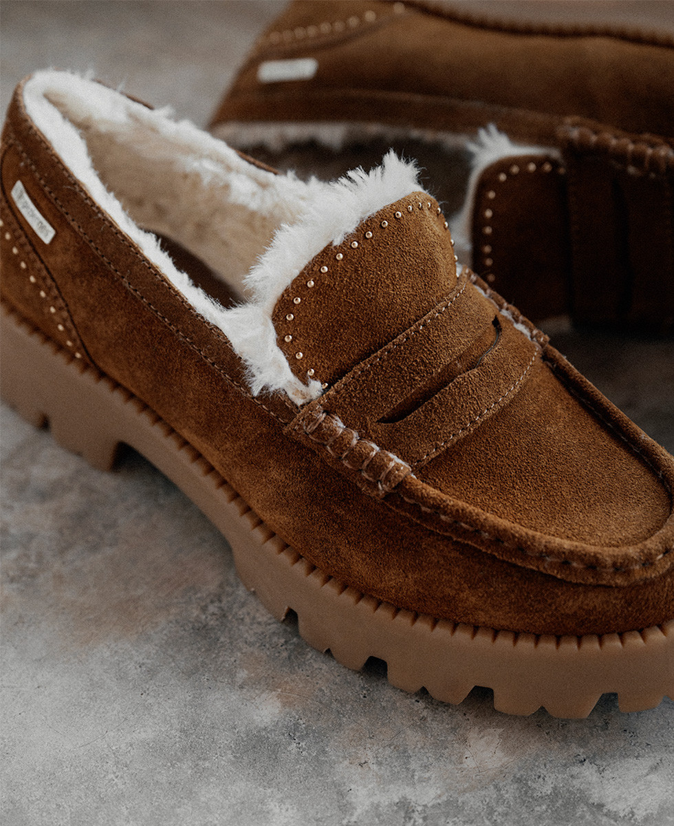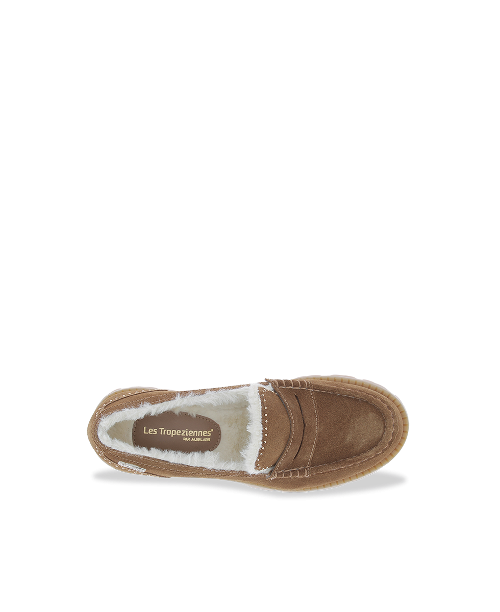 Learn more +These camel leather women's loafers are designed to offer optimal comfort while remaining stylish. Their white faux fur lining provides cosy warmth, ideal for cooler days. The thick, lugged T.P.R. sole guarantees excellent grip and enhanced durability.