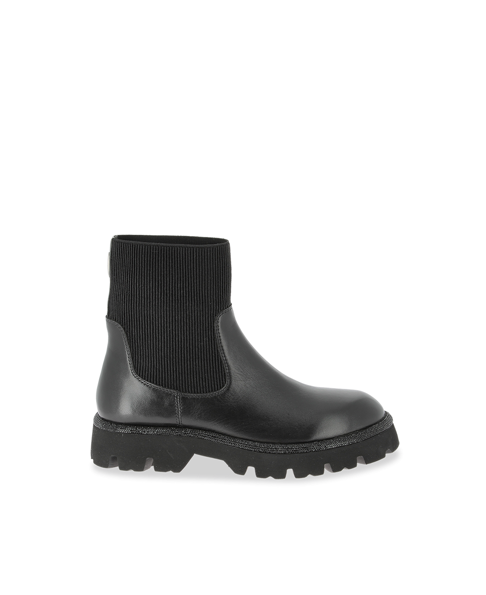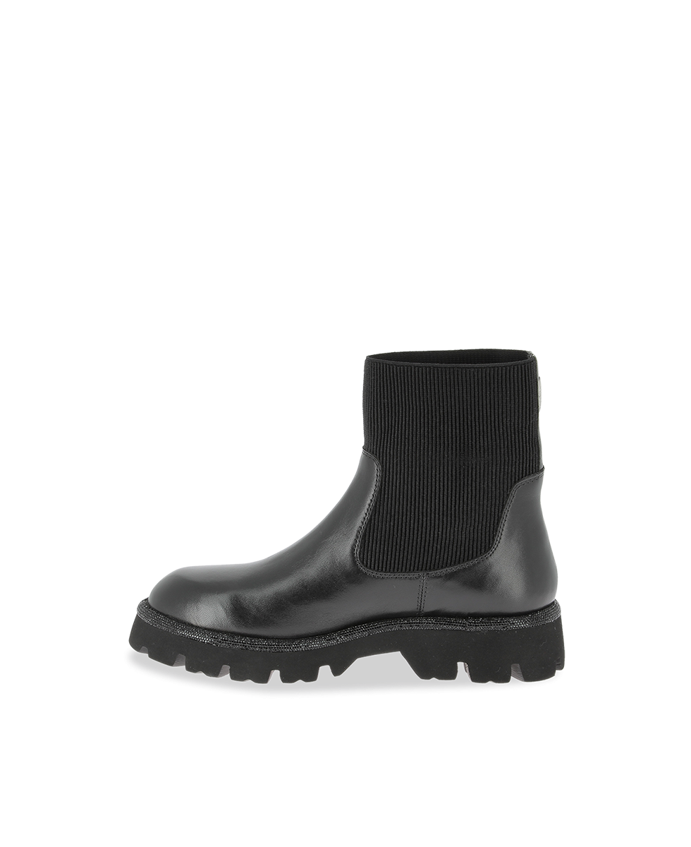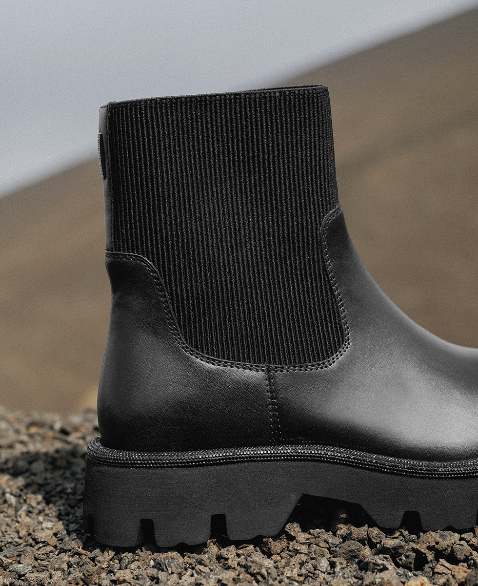 Learn more +These women's boots in black combine sleek style with functionality. Their mid-height upper combines a smooth leather base with a stretchy ribbed knit upper, offering a comfortable fit and a modern silhouette. The thick lugged sole provides excellent grip, ideal for active days in the city.