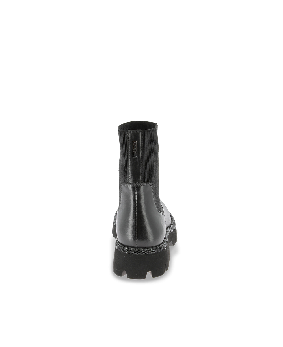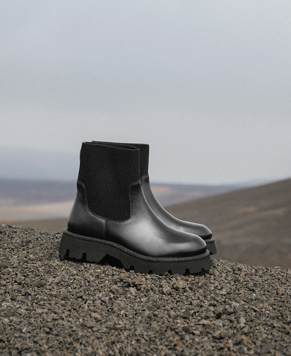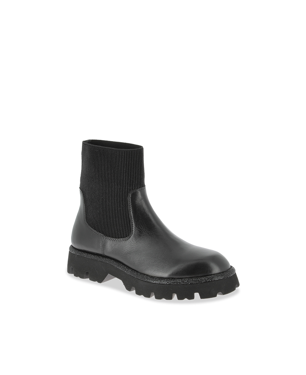 Learn more +These women's boots in black combine sleek style with functionality. Their mid-height upper combines a smooth leather base with a stretchy ribbed knit upper, offering a comfortable fit and a modern silhouette. The thick lugged sole provides excellent grip, ideal for active days in the city.