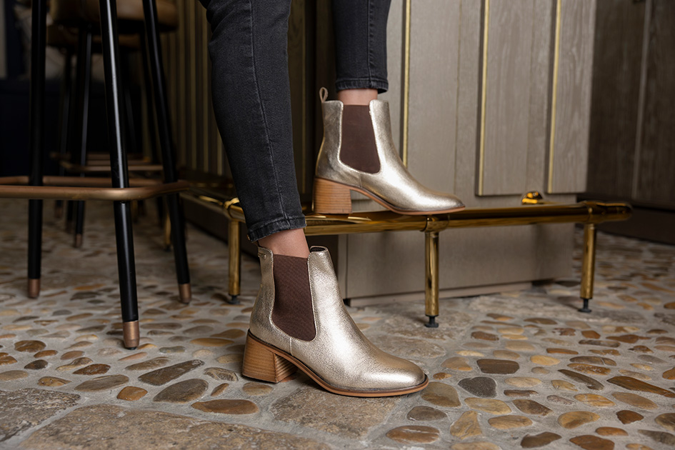 Nos nouvelles bottines chelsea FILOU font leur entrée dans nos et vos dressings ! A l'allure dorée et son talon, elles vous accompagneront partout et ajouteront ce peps à toutes vos tenues !