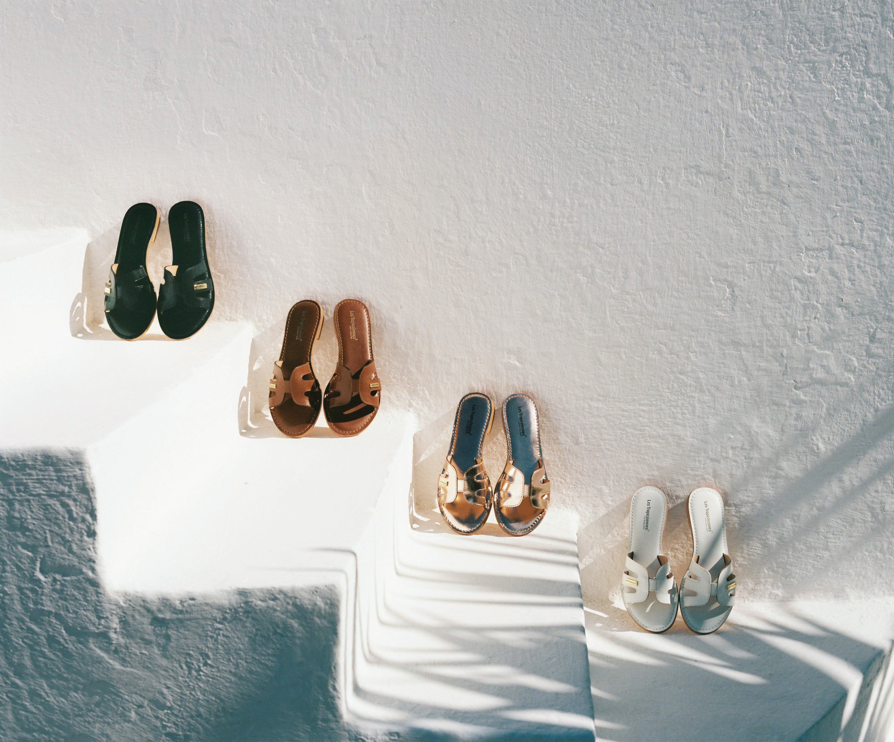 Chaque paire de sandales évoque l'allure d'un été bohème et chic où la sobriété se fond dans la lumière du sud. Entre bleu profond, blanc éclatant et touches de couleurs, les teintes de la mer et du ciel se reflètent sur des coupes raffinées et distinguées.