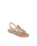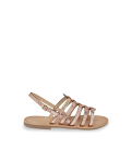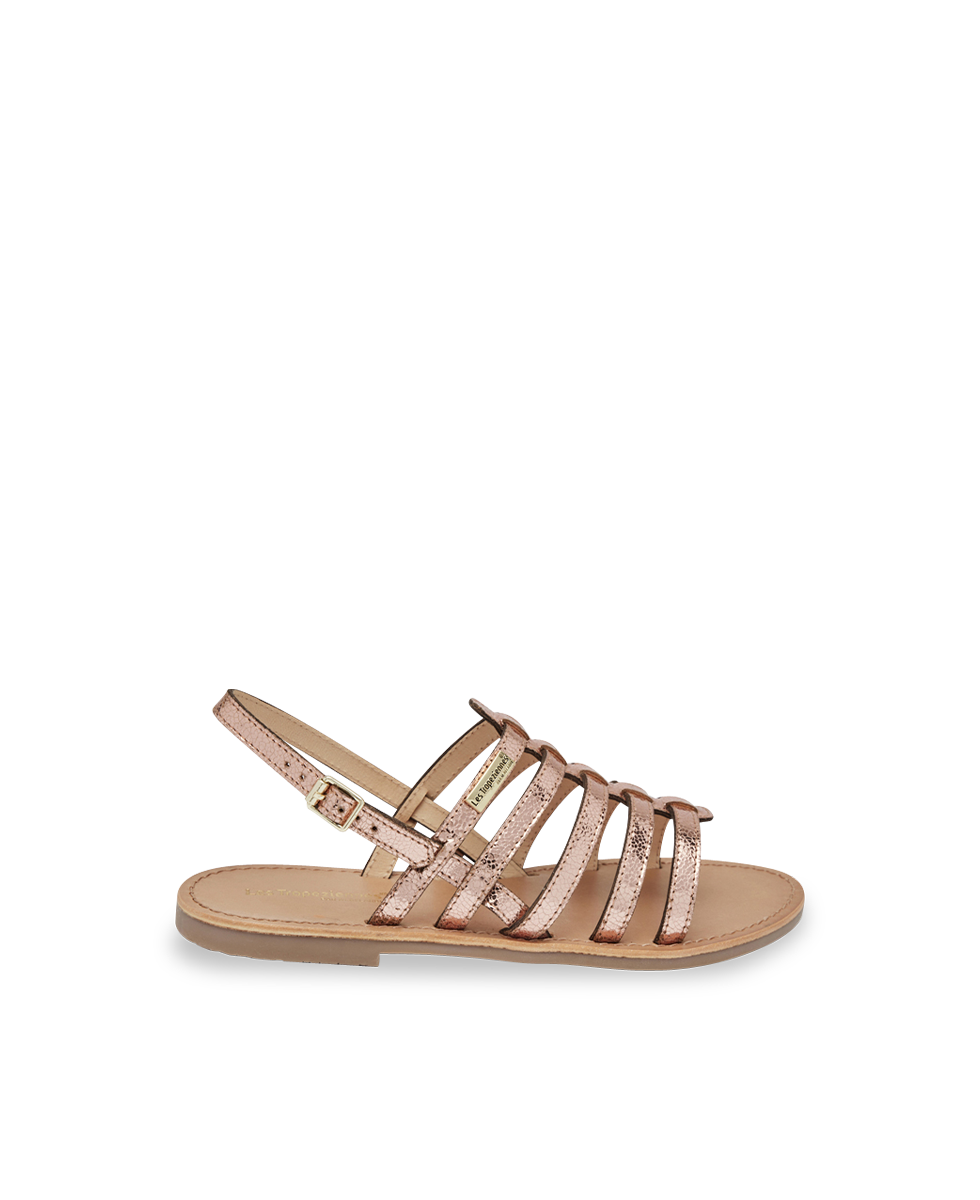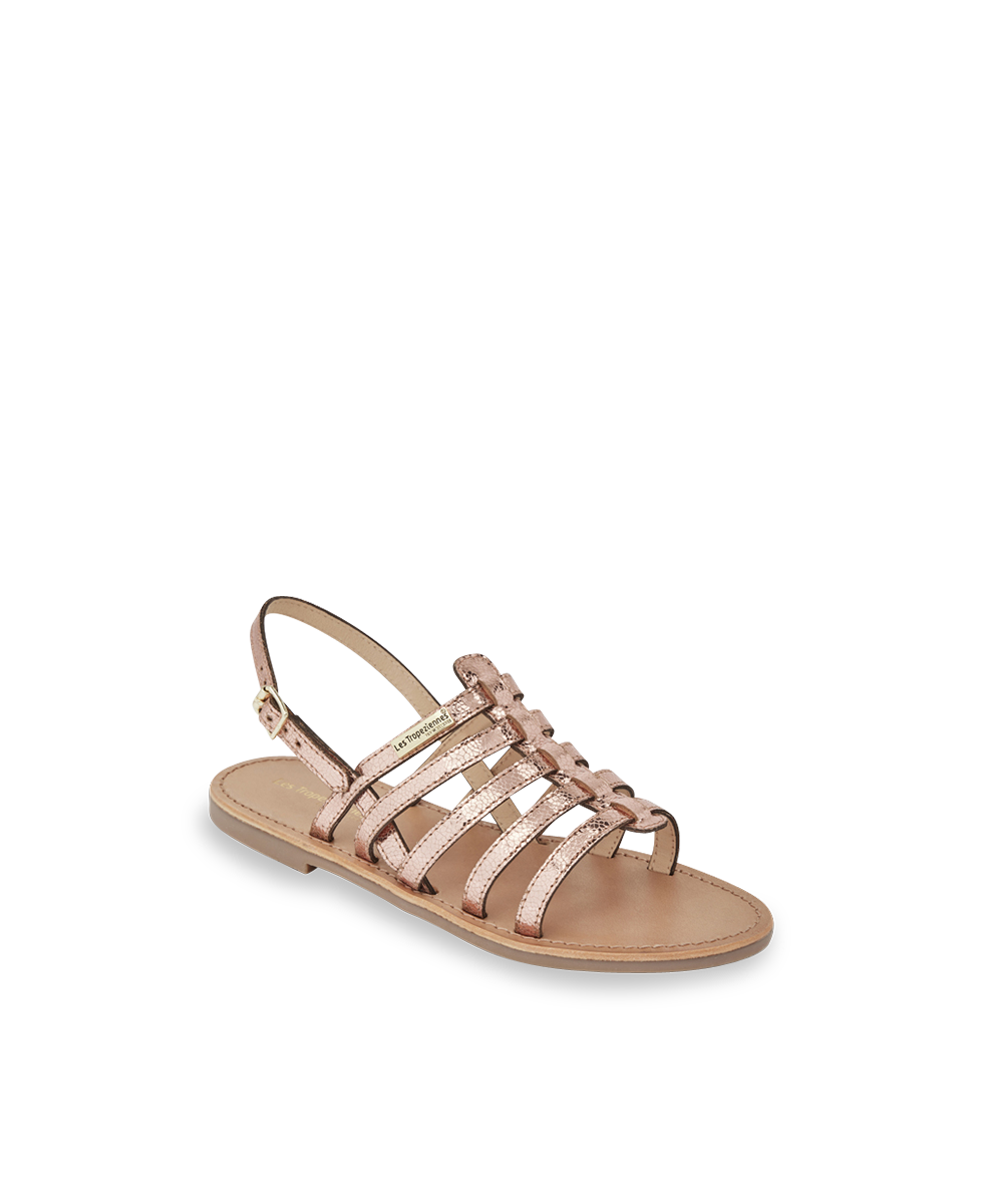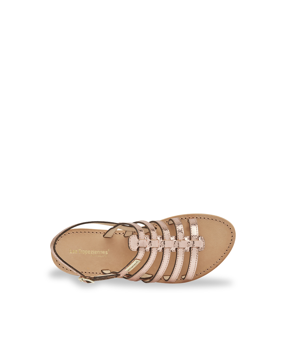 Découvrez l'élégance des sandales spartiates Hikano, avec leurs multiples brides en cuir de chèvre doré et boucle raffinée.