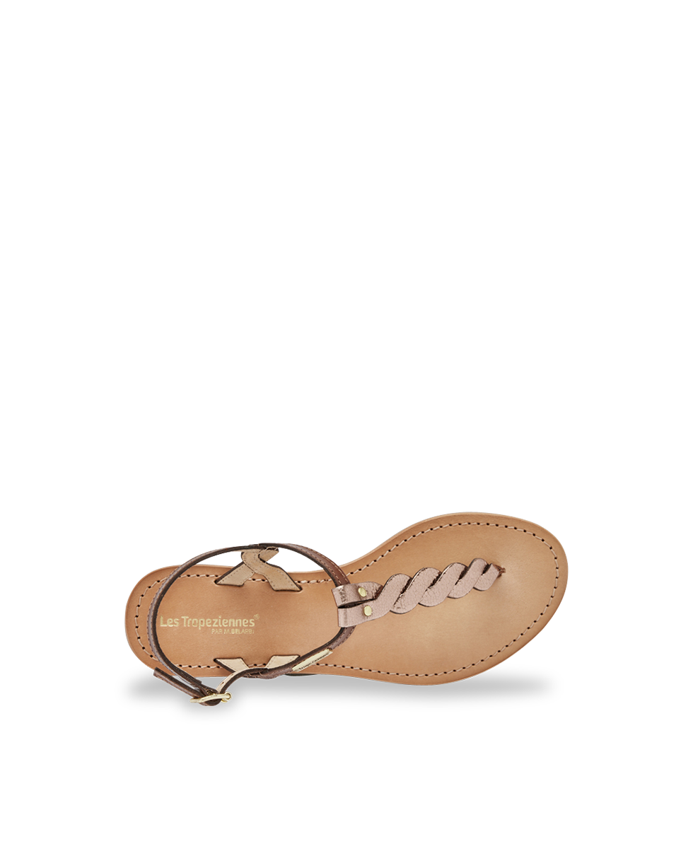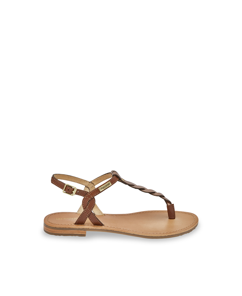 Découvrez nos sandales plates Hamsong en cuir avec entre-doigt tressé, boucle discrète et finitions métallisées pour un été plein de style et confort.