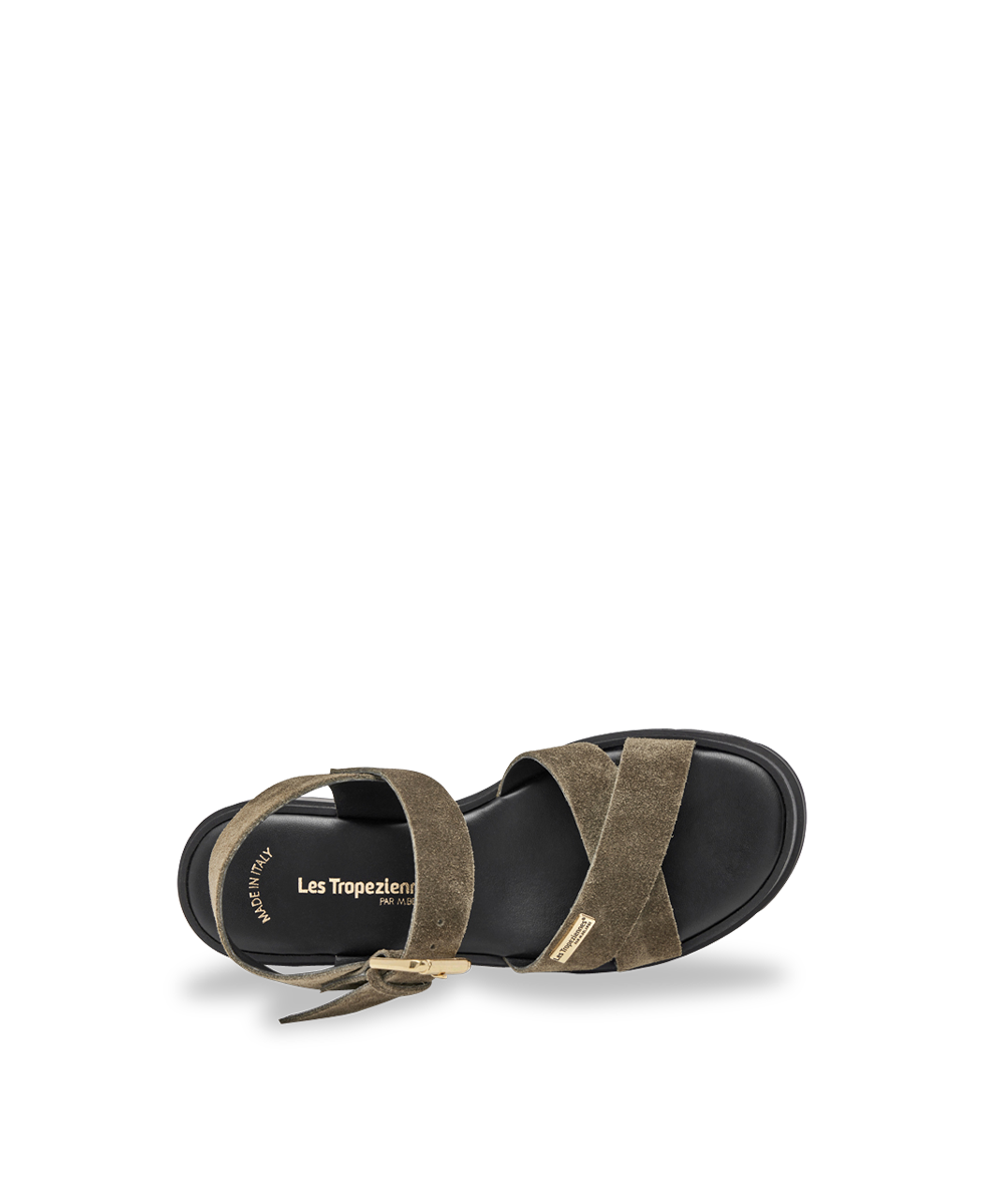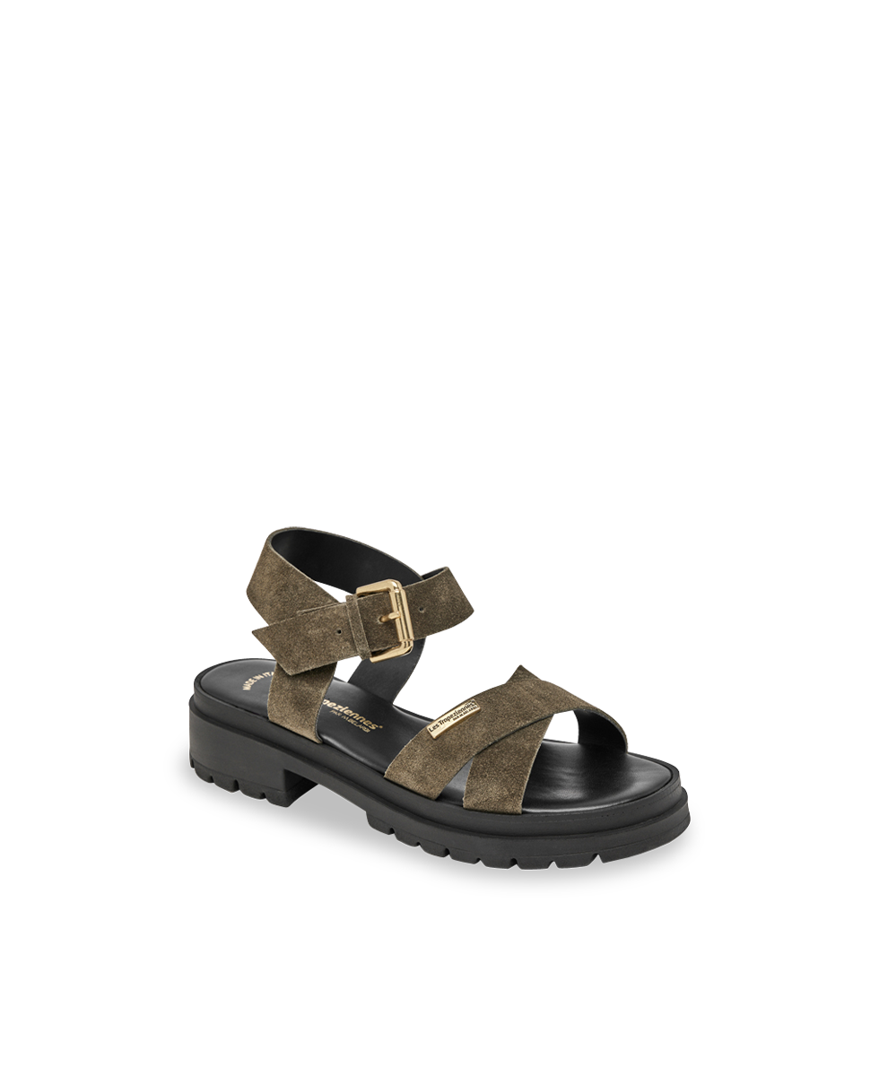 Découvrez nos élégantes sandales à talon Tihasued, avec brides croisées en veau velours et semelle crantée pour un confort sportif.