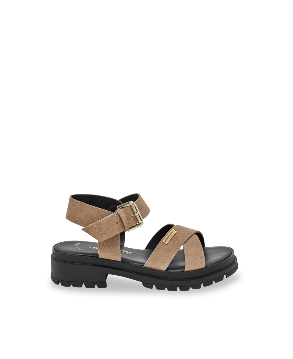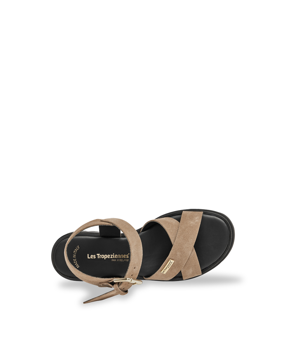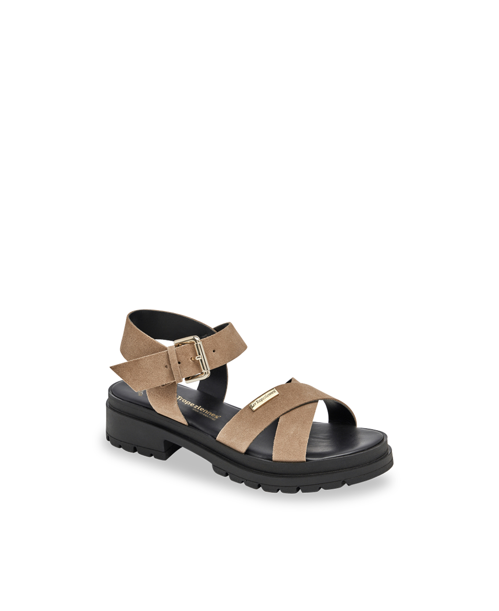 Découvrez nos élégantes sandales à talon Tihasued, avec brides croisées en veau velours et semelle crantée pour un confort sportif.